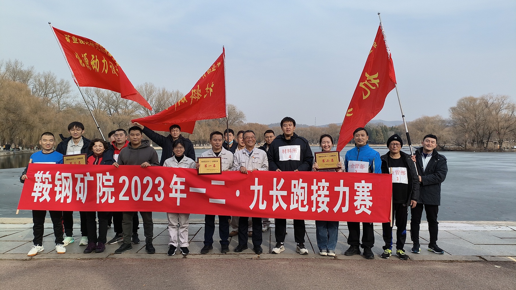 湖边旗帜飘扬,参赛队员精神饱满、蓄势待发,观众人头攒动,现场气氛热烈。伴随着一声枪响,第一棒队员冲出起跑线,场上欢呼声和呐喊声瞬间响起,上百双眼睛注视着他们矫健的身影。随着队员的身影由大变小,再由小变大,现场观众的欢呼声、加油声也随之起伏跌宕。队员们更是争分夺秒,奋力一博,即使疲惫也毫不懈怠。经过激烈角逐,最终材料所、企管部、能动所分获第一名、第二名、第三名。