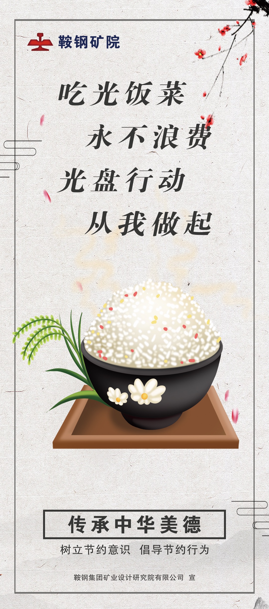 为进一步贯彻落实习近平总书记关于坚决制止餐饮浪费行为的重要指示批示精神,营造“节约粮食光荣,浪费粮食可耻”的浓厚氛围,倡导全体干部职工讲政治、顾大局、承美德,自觉践行勤俭节约、艰苦奋斗的理念,践行光盘行动,珍惜每一餐饭,节约每一粒粮,争做抵制浪费、爱粮节粮的践行者,健康餐饮、文明生活的倡导者。