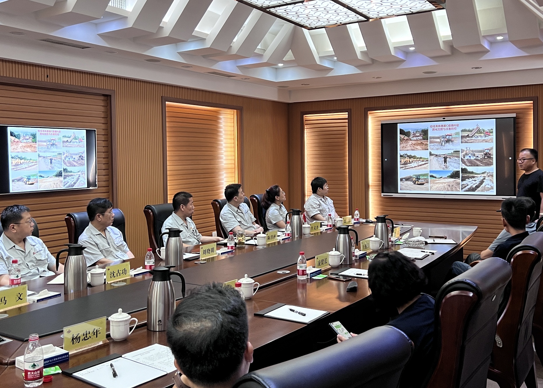 交流会上,凌贤长教授首先介绍了工业固废资源化综合利用技术、典型案例及发展方向,随后双方就弓长岭干磨干选项目尾矿处理、露天采场和排土场边坡加固技术进行了深入交流和探讨,并对下一步的深度合作充满信心;之后凌教授又介绍了锚索加固技术、双高压搅拌旋喷桩技术,对边坡加固、桩基础施工技术与我方进行了交流,此次交流活动达到了预期效果。